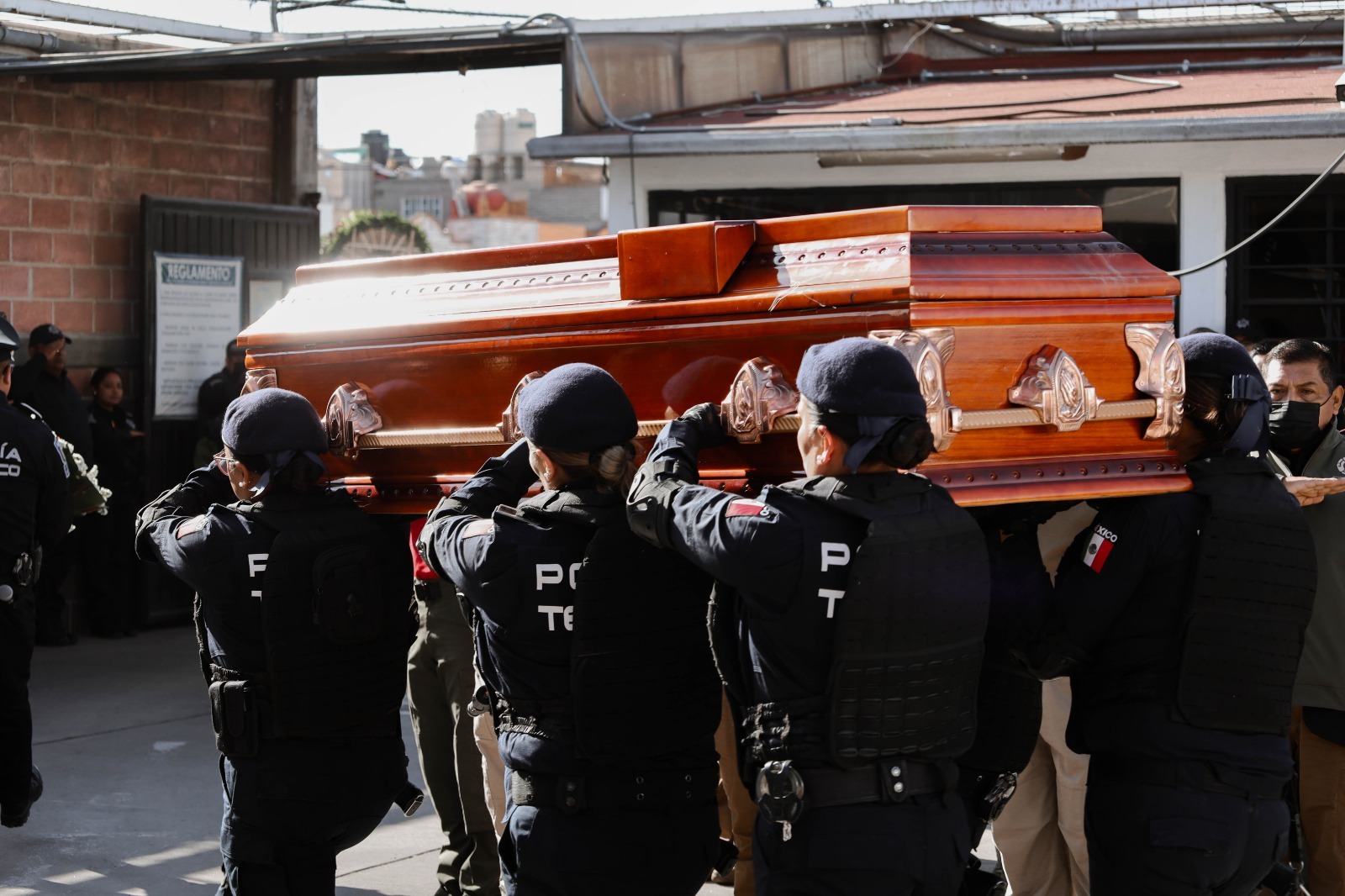 Texcoco, Edomex. 23 de febrero, 2023.- En las instalaciones del Centro de Comando, Control, Comunicación y Cómputo (C 4), fueron despedidos los elementos Valeria Katia González Bravo y Víctor Martínez Martínez, en donde los policías municipales y autoridades rindieron un homenaje póstumo a los elementos que fallecieron al estar desempeñando su labor se auxilió a la población.